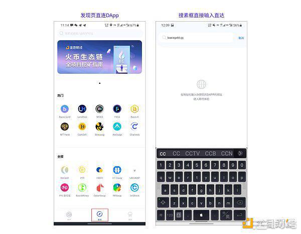 4、点击底部的【发现】菜单,即可使用已上架的火币生态链的DApp。(一大波DApp在路上)为了您资产的安全,建议在选择DApp的时候尽量选择上架钱包的DApp,谨防遇到一些高风险的DApp项目;若未找到您想要的DApp,可在上方搜索框输入DApp官网地址,进入直连。