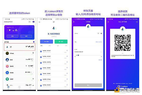 1、选择需要操作的代币(例如HT),点击左下角【转账】,收款功能点击后可以获取收款二维码和复制收款地址,同使用CodeBank钱包的用户可以直接扫码支付。(如遇到其他平台二维码,可能会有兼容性问题,此时最好可以使用复制粘贴功能操作)