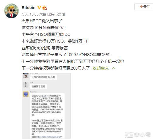 10分钟骗走500万?火币回应HSO跑路 非小号官方 2021年03月10日 08:52 微信扫一扫分享到朋友或朋友圈 3月10日下午,HECO链上项目HSO进行IDO后募集约3万HT,此后项目网站、电报群均无法打开,疑似跑路。火币方面表示,目前已经对有关地址进行风控,用户的资产不会丢失,并将联系有关方面妥善处理后续事宜。 针对此事件,杜均也在社群中表示“一般资产跑不掉”。非小号提醒用户,挖矿风险极高,请注意资金安全。