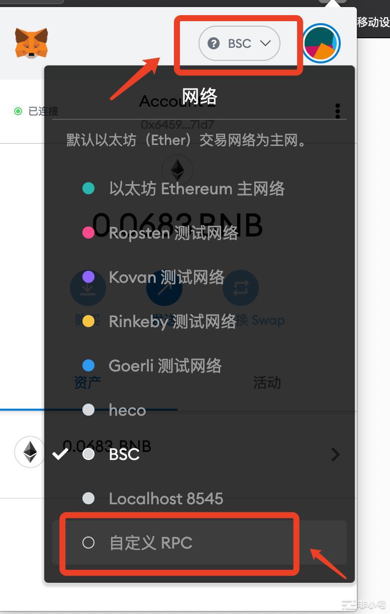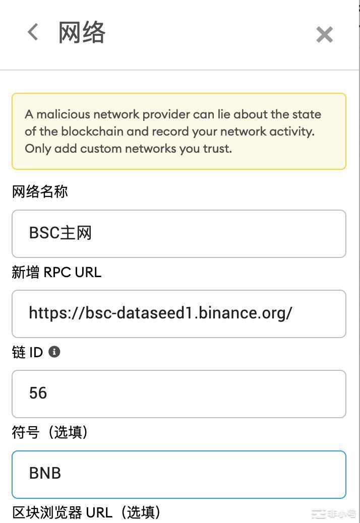 第1步:链接metamask小狐狸钱包,配置BSC网络:
